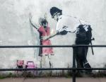 Arriba: Banksy parodia las medidas de seguridad extremas de nuestros tiempos con un policía cateando a una niña.